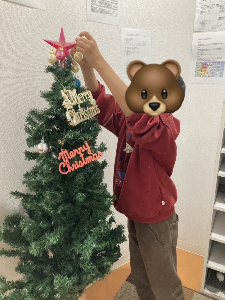 子どもたちは、通所後、ツリーに興味津々なご様子。クリスマスの飾りを渡してあげると、自分の好きなところに飾っていました。