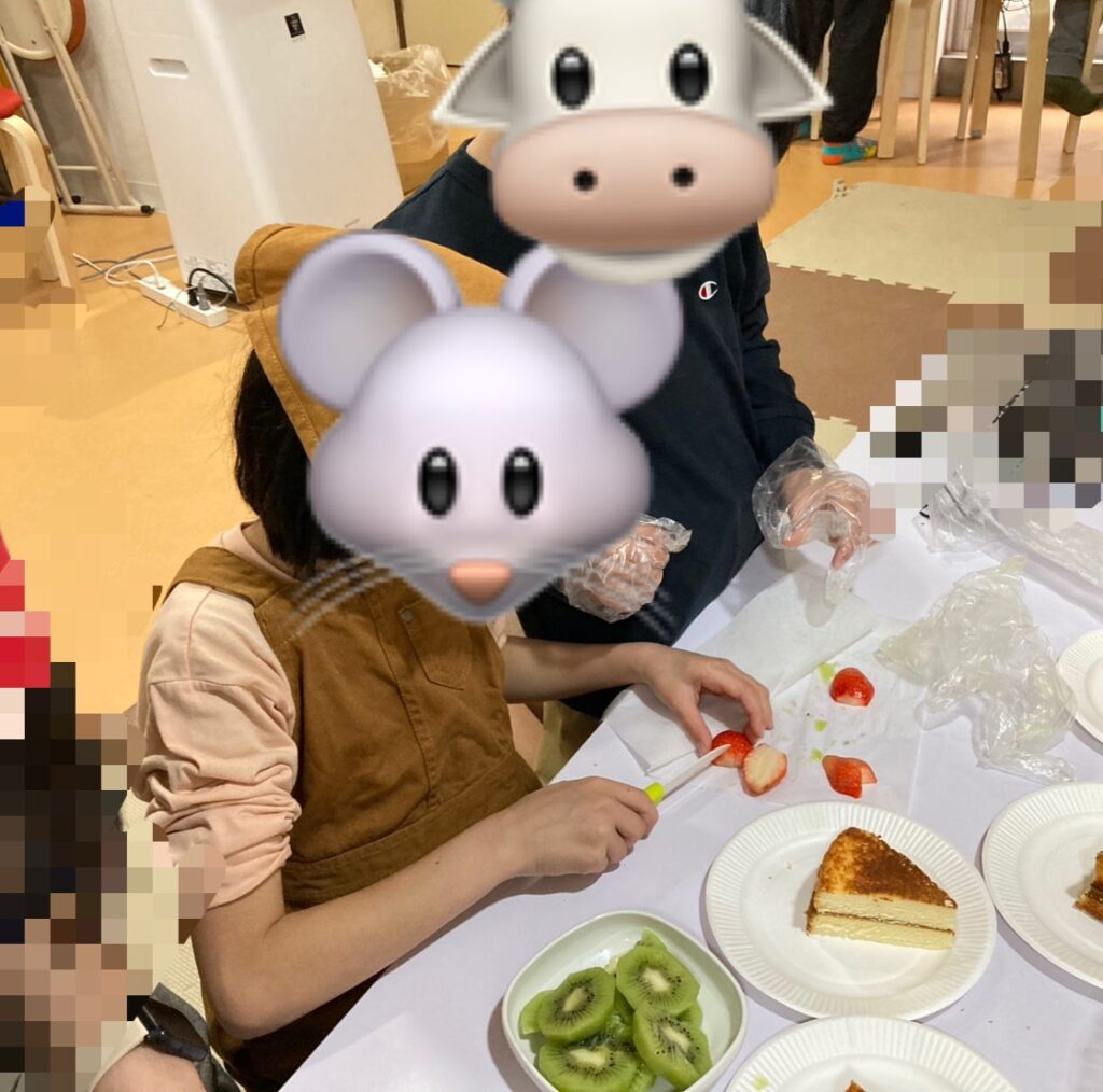 まずはスポンジケーキを上手にカットし、いちごや、キウイも職員と一緒に恐る恐るカットし、☆星形や♡ハート形にくり抜いたりしました。