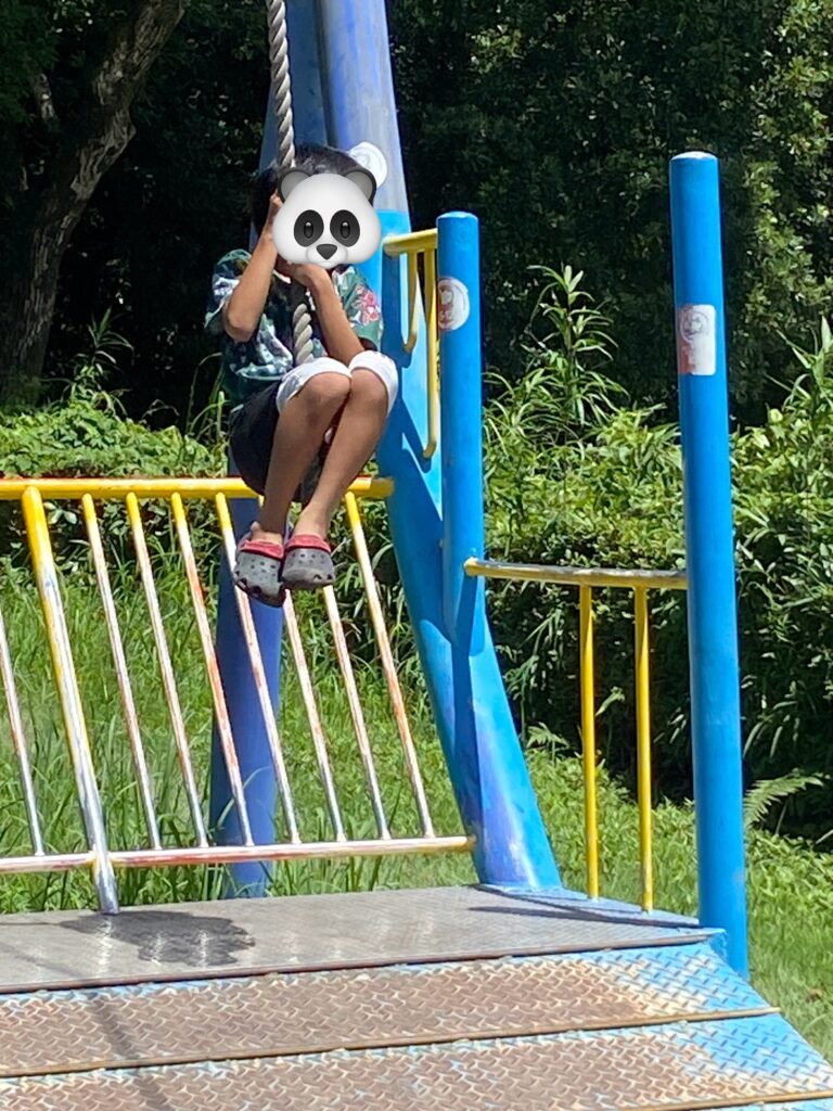 公園にきてすぐに遊んだのは、ターザンロープでした。ロープをスタート地点まで自分たちで持っていき、思いっきり飛んで乗って滑ってました。