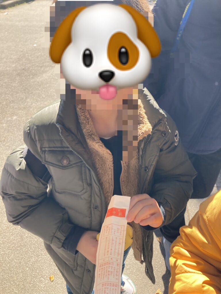 お祈りをした後は、おみくじに挑戦しました。「大吉」が出た子もいれば、「小吉」・「吉」が出ている子がみられ、「先生~!大吉が2回も出た~」と大喜びしている子もいましたね😀