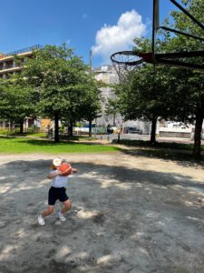 公園では、バスケットボールのリングがあり、シュートゲームをしたり、職員がダンクを見せたり