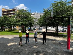 公園では、バスケットボールのリングがあり、シュートゲームをしたり、職員がダンクを見せたり