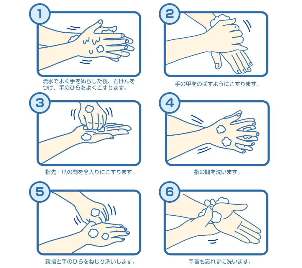 まず、基本は、やはり「正しい手洗い」ですね。外出から帰ってきた時には、爪を短く切っておくことや時計や指輪をつけている際は外してから行いましょう。正しい手の洗い方についは以下の画像をご覧ください。
