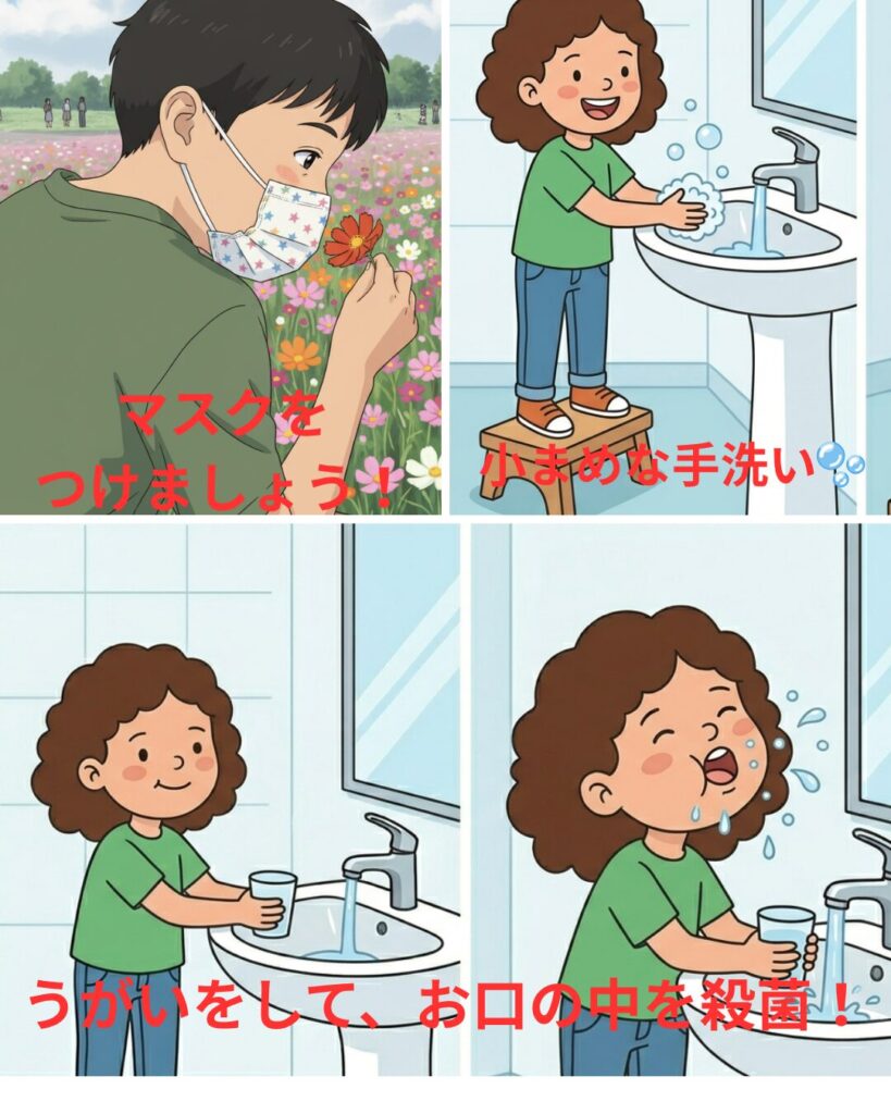 2.基本の徹底: 外出時のマスク着用や、こまめな手洗い・うがいを心がけましょう🧼