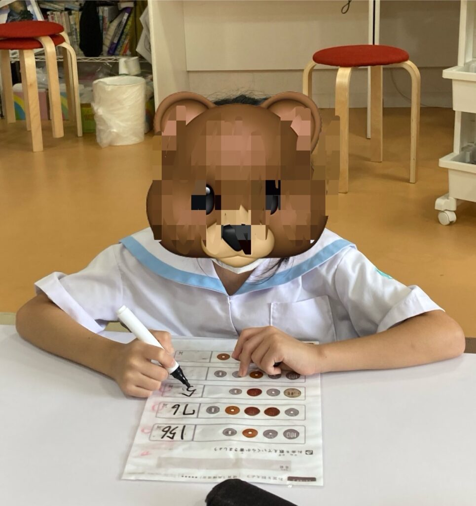 まだ、そんなにお金の計算に慣れていない子は、イラストを観ながら、分からないときには先生に聞きながら解いていきます。
