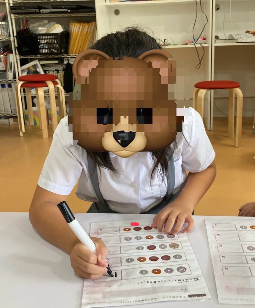 なので、今回のSSTの活動にて、ワークシートに書かれたお金のイラストをみて、いくらあるかを答える(書く)活動を行いました。