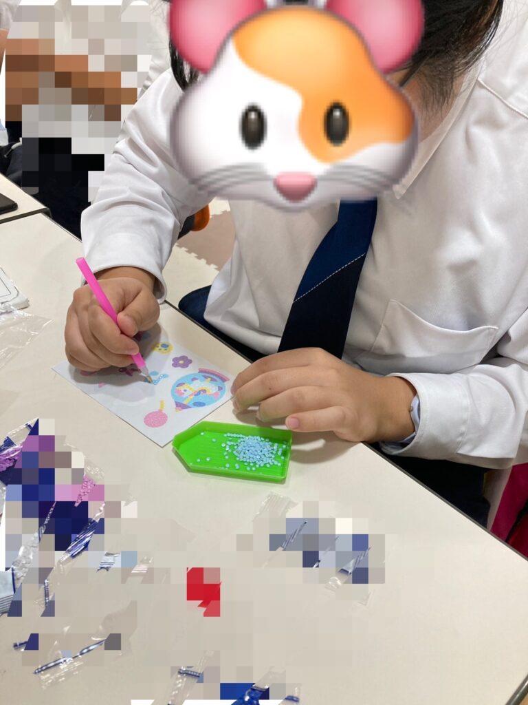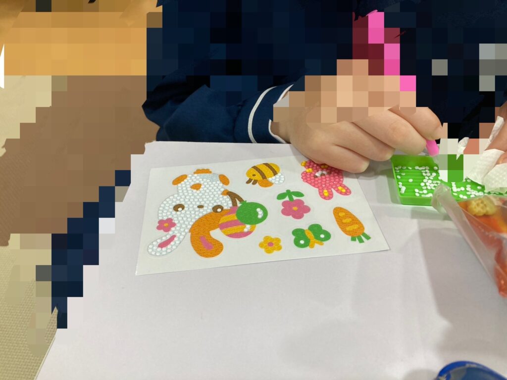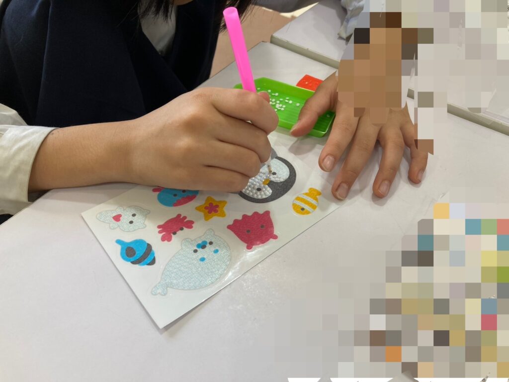 今回の活動で使ったアイテムは、DAISOなどの100円ショップで手軽に買える「ビーズアートシール」や「ビーズイラストシール」を用いて行いました。