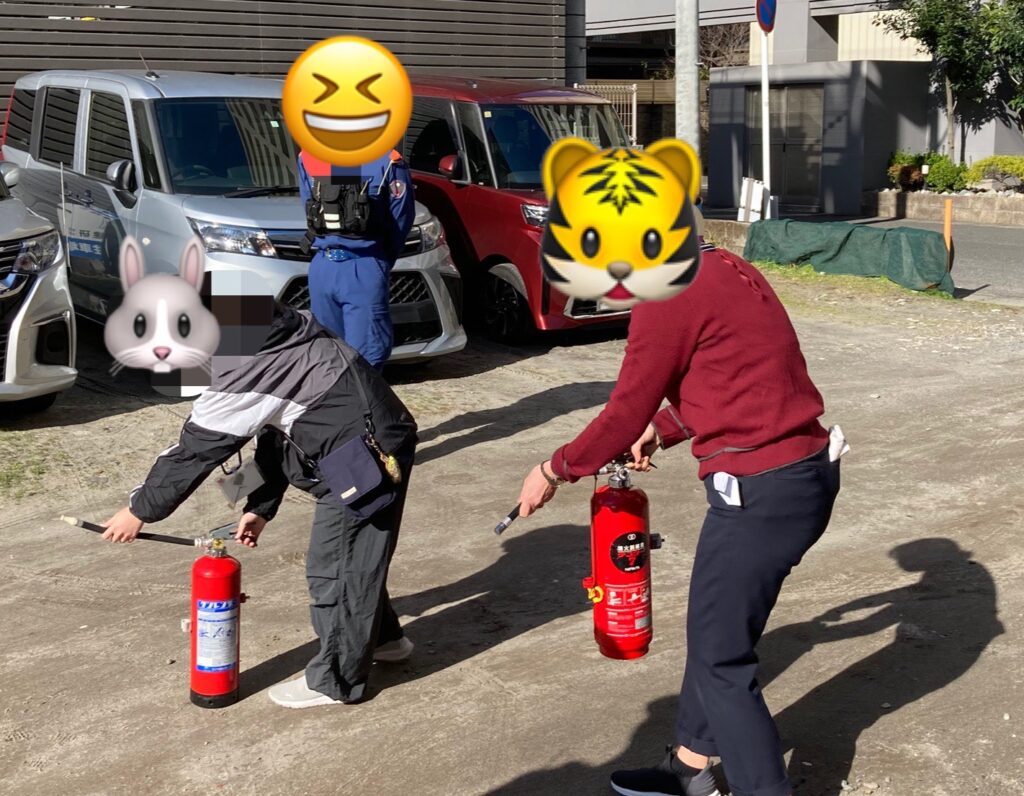 避難完了後は、消防隊員の方のご指導のもと、消火訓練を行いました。 消火器の正しい使い方だけでなく、「火事だー!」と大声を出して周囲に知らせるなど、実際に火災を見つけた時の大切な行動を学ぶことができました。