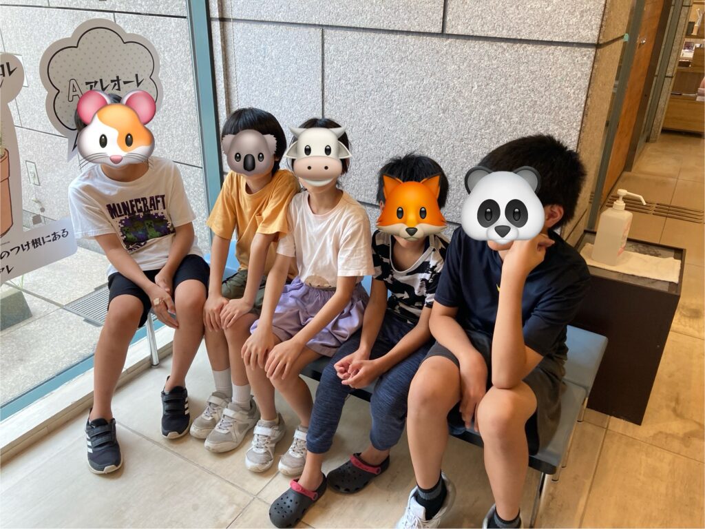 疲れ果てて、館内にあるベンチに並んで休憩をとる姿も見られました。記念に写真もパシャリと撮ってもらいました。みんな、良い表情ですね。